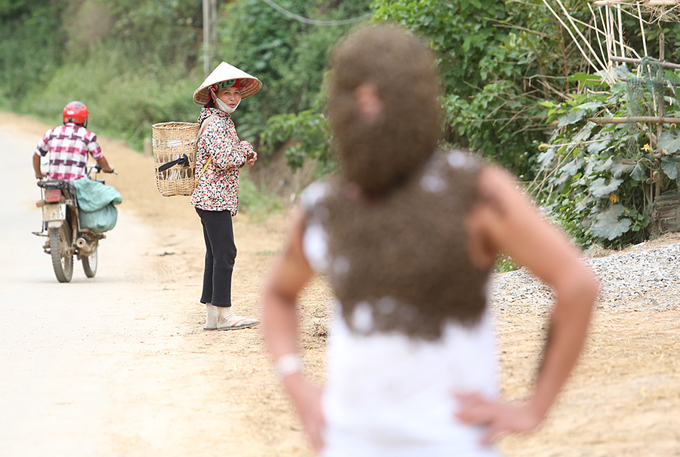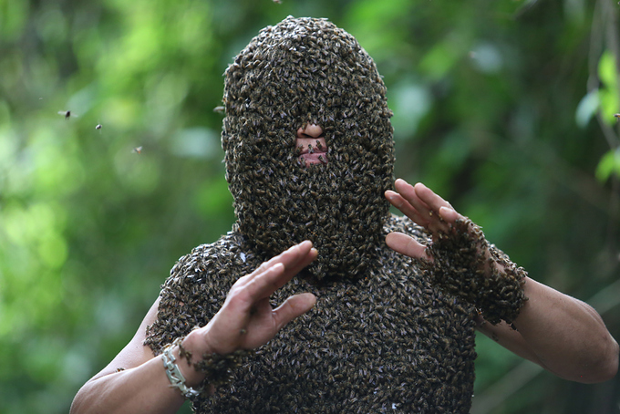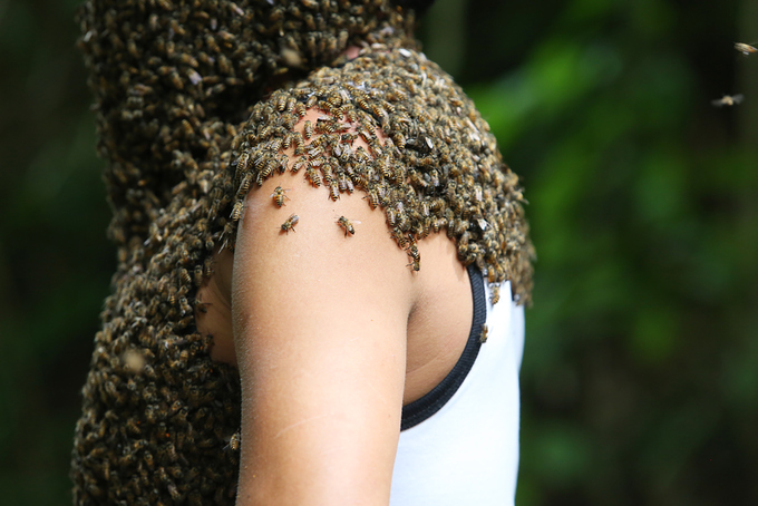 Đàn ong đậu kín nhưng "dị nhân" vẫn thoải mái di chuyển, nói chuyện.