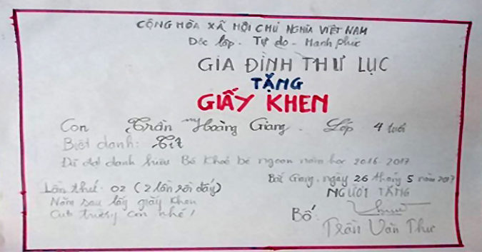 Cậu con trai Hoàng Giang của anh Thư đi học đã 2 năm mà chưa năm nào được giấy khen “bé khỏe bé ngoan”. Điều này khiến cậu bé rất buồn, bởi đa số các bạn ở lớp đều có. Nhìn thấy cậu con trai buồn thiu, ông bố này đã làm một “việc cao cả hơn nhà trường”, tạo ra một tờ giấy khen để thưởng cho con.