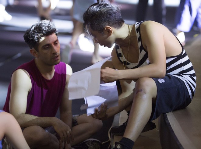 Trong khi đó, ông xã kém tuổi bận rộn bàn bạc kịch bản, thay vợ quan sát chung các tiết mục của nhóm vũ công.