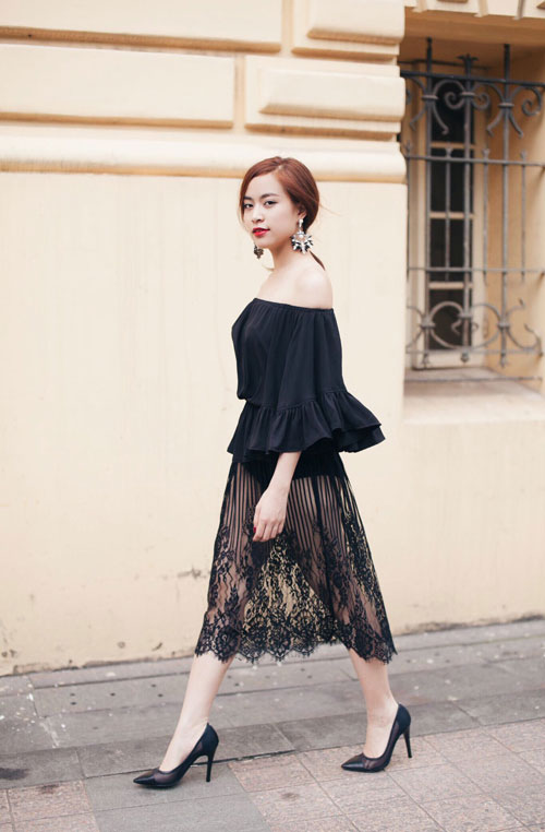 Old  Cool Thời trang đầm trễ vai gợi cảm của Hoàng Thuỳ Linh
