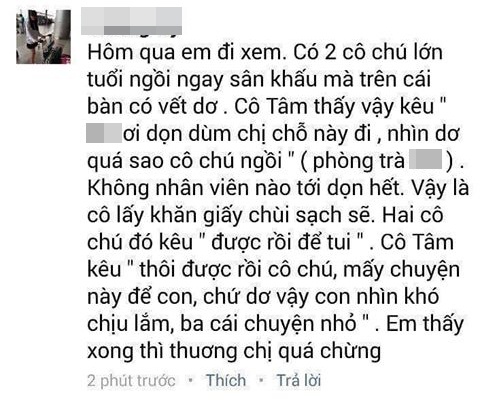 Khi thấy bàn của hai cô chú có vết dơ, Mỹ Tâm đã kêu người phục vụ phòng trà ra dọn. Tuy nhiên khi không thấy ai ra dọn, Mỹ Tâm tự lấy khăn lau bàn sạch sẽ. Khi hai cô chú kêu tự lau thì Mỹ Tâm đáp: “Thôi được rồi cô chú, mấy chuyện này để con, chứ dơ vậy con nhìn khó chịu lắm. Ba cái chuyện nhỏ”. Hành động này của Mỹ Tâm được rất nhiều người khen ngợi. Fans cho rằng nữ ca sĩ vừa có tâm vừa có tầm.