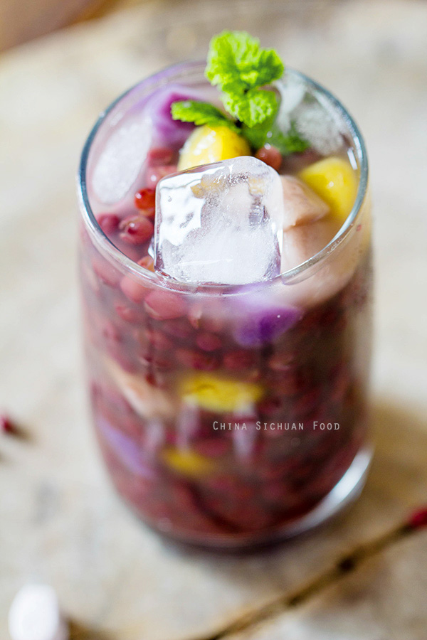 - Múc chè đậu đỏ ra ly, thêm khoai môn lên trên và thưởng thức.
