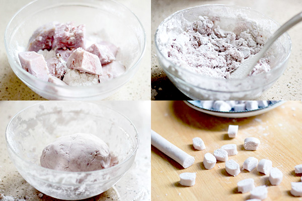 - Nặn bột thành từng viên nhỏ vừa ăn.