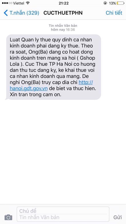 Tối ngày 19/6, chị Vũ Thu Hương, chủ trang bán quần áo trên facebook nhận được tin nhắn từ Cục thuế Hà Nội yêu cầu đăng ký để nộp thuế thu nhập cá nhân. Nội dung tin nhắn cụ thể: “Luật quản lý thuế quy định cá nhân kinh doanh phải đăng ký thuế. Theo rà soát, ông (bà) đang có hoạt động kinh doanh trên mạng xã hội. Cục thuế Thành phố Hà Nội có hướng dẫn thủ tục đăng ký, kê khai thuế với cá nhân kinh doanh qua mạng. Đề nghị ông (bà) truy cập địa chỉ http://hanoi.gdt.gov.vn để biết và thực hiện. Xin trân trọng cảm ơn”.