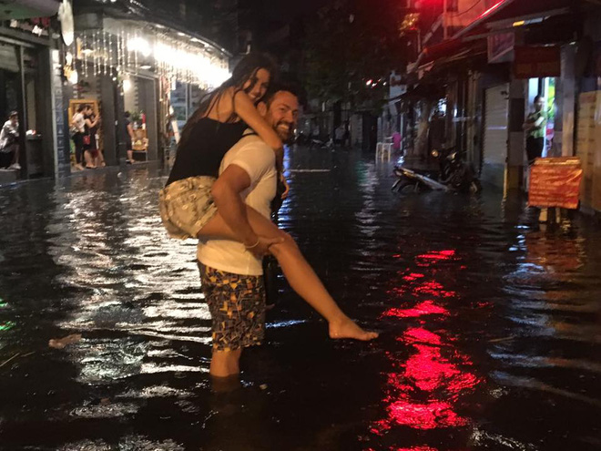 Trong khi đó, tại phố Tạ Hiện, nước ngập sâu khiến xe máy bị ngâm nước la liệt. Tuy nhiên, nhiều cặp đôi, du khách nước ngoài tỏ ra khá vui vẻ. Họ cùng nhau trêu đùa, cõng nhau dưới cơn mưa và di chuyển bằng xích lô để ngắm cảnh vật xung quanh.
