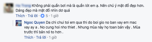Tuy nhiên, bên cạnh những lời khen dành cho hình thể quyến rũ của Ngọc Quyên, không ít fan tinh ý nhận ra cựu siêu mẫu đã vô tình lộ vùng nhạy cảm. Thậm chí, một cư dân mạng còn thẳng thừng nhận xét Ngọc Quyên đang mặc nội y thay vì quần bơi và khuyên nên chú ý vì “dáng đẹp mà mặc đồ nhìn dơ quá”. Đáp lại, Ngọc Quyên giải thích: “Dạ chị chửi tội em quá thì đồ bơi giờ nó bán vậy em vậy ạ. Nó cũng hơi nhỏ thiệt. Nhưng mùa này họ toàn bán vậy. Mùa trước thì bản nó to hơn”.