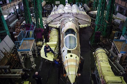 Các nhân viên của PJSC "Công ty Sukhoi" Tổng công ty chế tạo máy bay trong một xưởng lắp ráp chiến đấu cơ T-50.