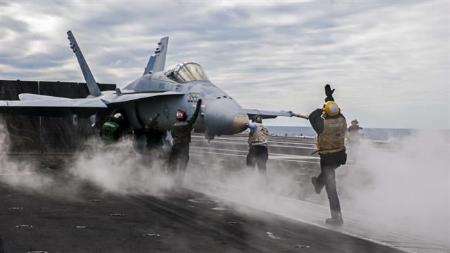 Chiến đấu cơ F/A-18 chuẩn bị cất cánh từ tàu sân bay.