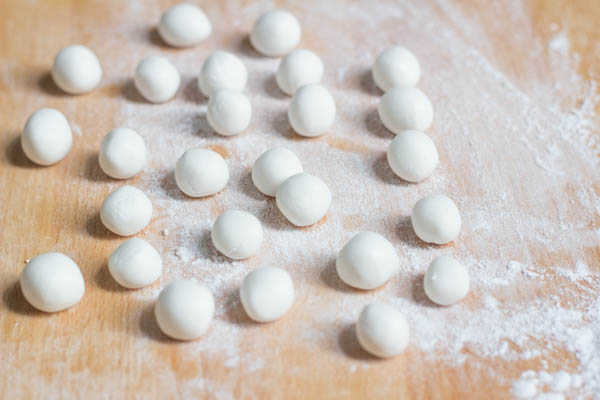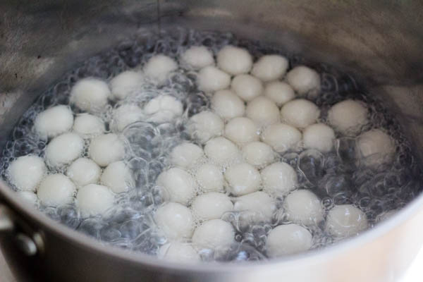 - Đun sôi một nồi nước, từ từ thả những viên bột vào, nấu cho đến khi các viên bột nổi lên trên bề mặt nồi nước, tiếp tục đun thêm 30 giây nữa.
