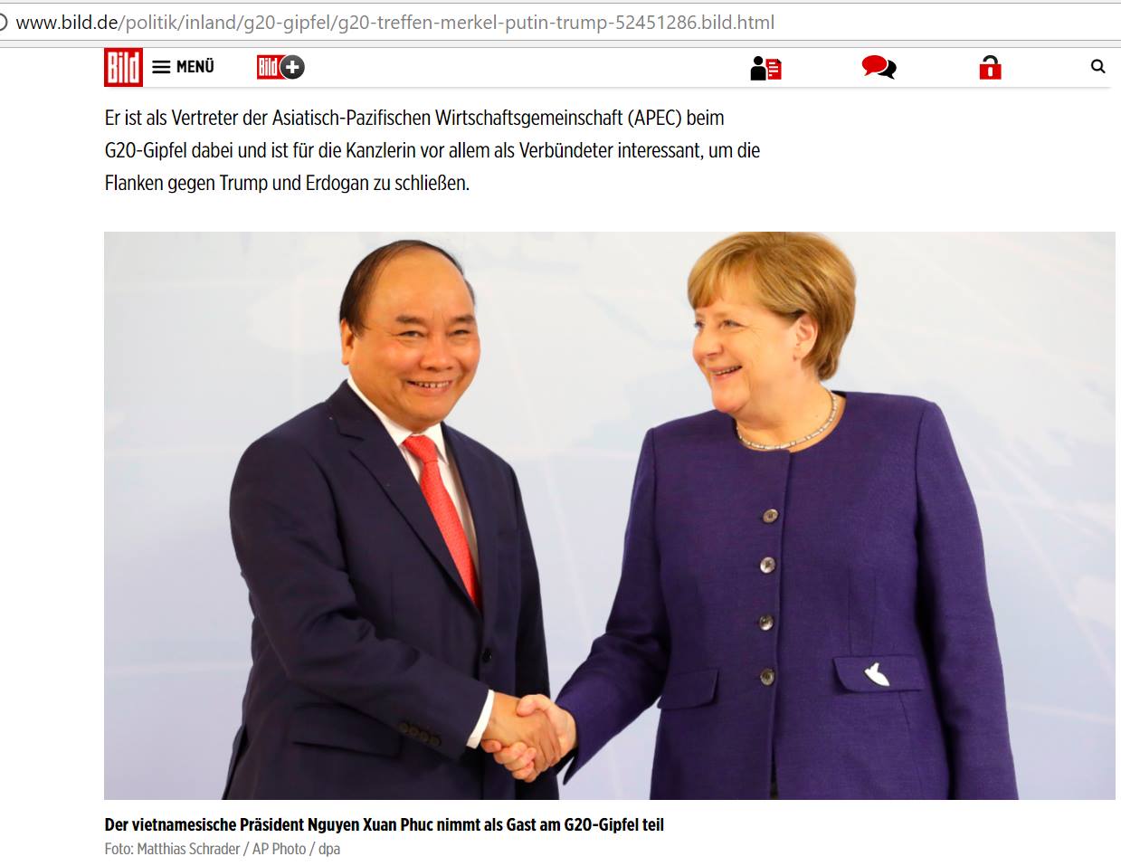 Cuộc gặp diễn ra trong 30 phút và chủ yếu chỉ trao đổi các việc của Apec 2017 thôi - vì mời VN dự G20 với tư cách này. Tờ Bild có số lượng phát hành lớn nhất nước Đức số ra hôm nay viết rất rõ, bà Merkel chào đón ông Phúc sang dự G20. Còn quá trời nội dung khác trong cuộc gặp mà các báo chính thống Việt Nam vừa đưa tin, đều là thêm thắt vô ha. Hoàn toàn không có vụ hội đàm giữa 2 nước.