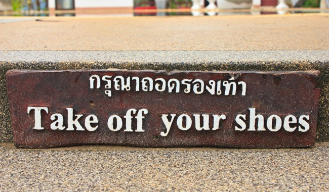 Khi đến thăm nhà một ai đó hoặc thăm đền chùa, các địa điểm tôn giáo, bạn nên để ư xem nơi đó có quy định phải cởi giày hay không. Nếu có, bạn hăy tháo giày ra như một cách thể hiện sự tôn trọng. Một điều nữa bạn nên chú ư là đừng bao giờ bước lên ngưỡng cửa khi đến thăm nhà v́ họ tin rằng đó là nơi linh hồn của những người quá cố sống.