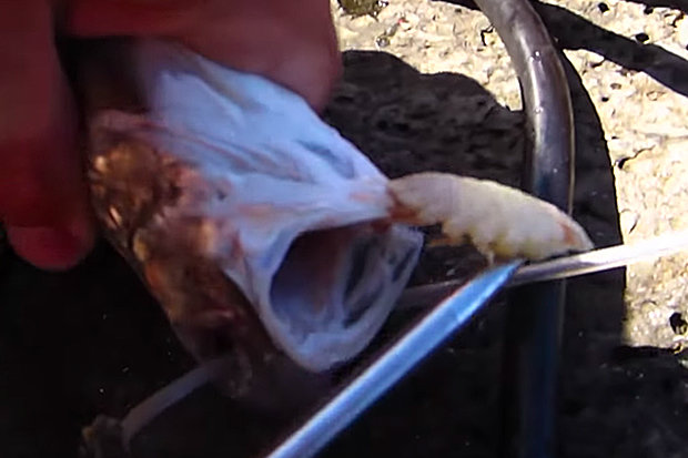 Theo Daily Star, đoạn video cho thấy một vật lạ màu trắng nằm trong miệng con cá. Nhưng đến khi người đàn ông dùng thanh sắt moi con vật ra thì người ta mới biết đó là sinh vật sống.