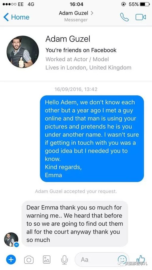 Emma viết: "Xin chào Adam, chúng ta không biết nhau nhưng cách đây một năm, tôi có quen với một người đàn ông qua mạng, người đàn ông đó đã sử dụng hình ảnh của anh để giả mạo đó là mình. Tôi không biết chủ động liên lạc với anh có thỏa đáng hay không nhưng dù sao tôi vẫn cần thông báo cho anh biết".