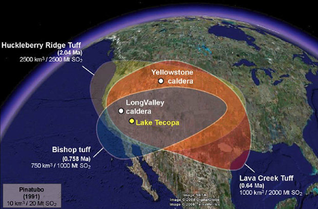Miệng núi lửa Long Valley rộng tới 32km, từng tạo ra vụ phun trào rộng hàng trăm ngàn km2, bao phủ bắc Mỹ trong tro bụi độc hại.