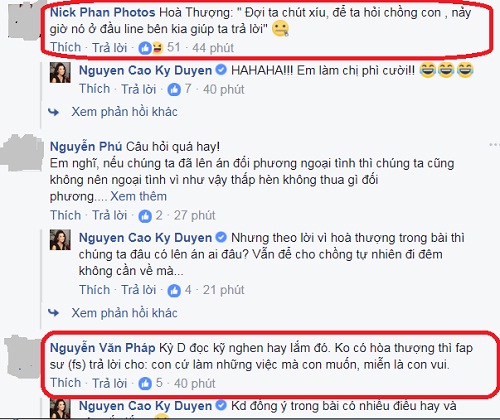 Liên quan đến vấn đề này, MC Nguyễn Cao Kỳ Duyên vừa chia sẻ bài viết khá dài có tựa: "Phật dạy khi chồng ngoại tình, vợ chỉ cần làm điều sau là đủ" trên trang facebook cá nhân gây sự chú ý. Bài viết này mang hình thức là đoạn hội thoại giữa nhân vật bà vợ và vị hòa thượng đề cập đến chuyện có chồng ngoại tình. Cụ thể, MC Kỳ Duyên viết: