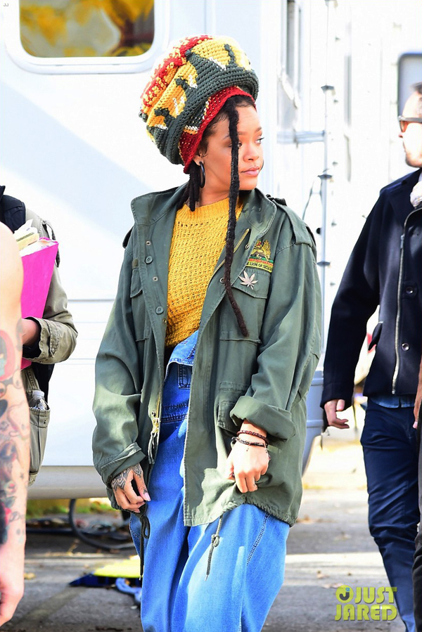 Bước xuống phố ở New York để tới địa điểm chụp hình cho tạp chí Paper hôm 7/2, Rihanna diện bộ cánh rộng lùng bùng, đội trên đầu món phụ kiện mà theo New York Daily News miêu tả là "trông giống tấm vải trùm trong tiệm cắt tóc".