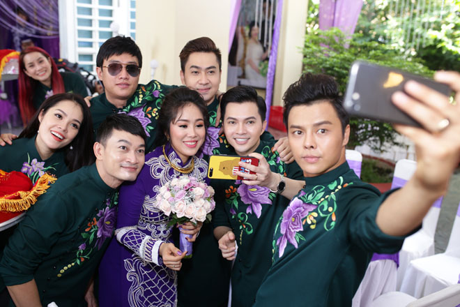 Dàn phù rể, phù dâu bưng mâm quả có nhiều đồng nghiệp thân thiết với Lê Phương như ca sĩ Nam Cường, diễn viên Quốc Thái, Trung Dũng, Diệp Bảo Ngọc, Dương Cẩm Lynh, Thanh Trúc,...