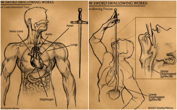 Cần khẳng định rằng, nuốt kiếm không phải là 1 màn ảo thuật thông thường liên quan đến ảo giác mà người biểu diễn phải khổ luyện kỹ năng cực vất vả và nguy hiểm mới có thể làm được.Nói đơn giản, nuốt thanh kiếm là 1 loại tương tác giữa 2 đối tượng cơ bản không giống nhau - đường tiêu hóa trên của con người (upper gastrointestinal - GI) và thanh kiếm.