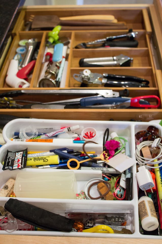 Căn bếp dường như là trung tâm của cả gia đình, nơi tập hợp mọi thứ nhỏ nhặt, từ dây chun, kẹp tóc tới băng cá nhân hay pin. Những thứ lặt vặt chưa có mục đích sử dụng thường bị quăng tới bàn bếp gây mất mỹ quan. Bạn hãy để riêng 1 ngăn kéo ở tủ bếp làm nơi cất trữ những món đồ nhỏ này phòng trường hợp cần đến, nên chia thành các ngăn nhỏ để dễ tìm hơn khi cần.