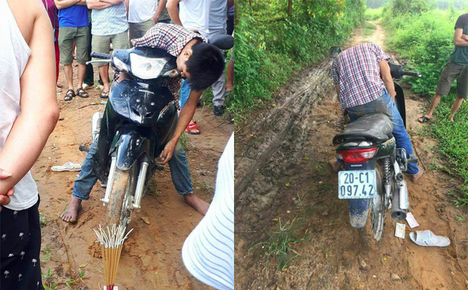 Ghi nhận tại hiện trường, nam thanh niên mặc áo kẻ, quần bò, chân không đi giầy, dép. Nam thanh niên ngồi trên chiếc xe máy ở giữa đường, hai chân vẫn chạm đất. Đầu nam thanh niên gục về phía đầu xe máy.
