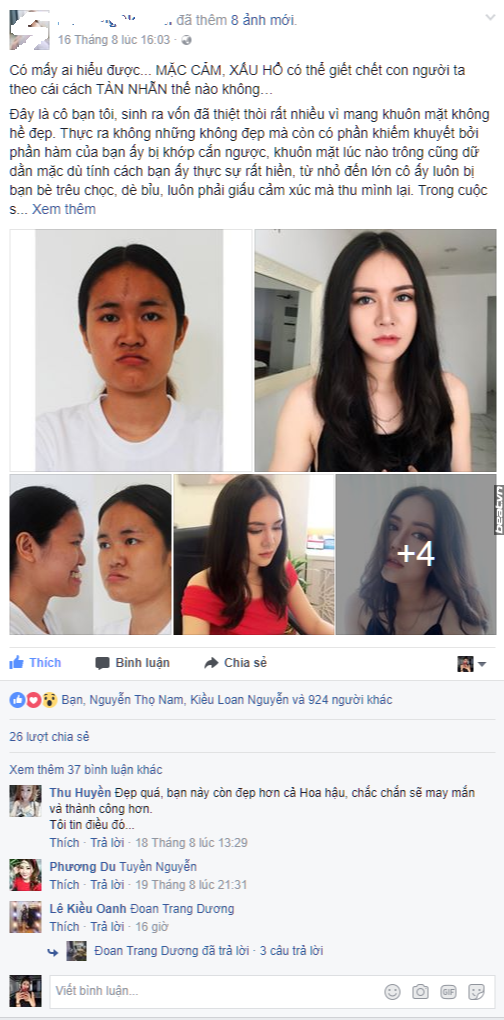 Những ngày qua, thông tin về sự lột xác đáng kinh ngạc của cô gái xấu xí nhờ PTTM thu hút rất nhiều sự chú ý của cộng đồng mạng. Thông tin được đăng tải từ trang cá nhân của một người bạn chơi thân với cô gái này. Từ những chia sẻ về sự mặc cảm khi mang vẻ ngoài xấu xí của cô gái, người bạn này đã nói lên quan điểm ủng hộ phẫu thuật thẩm mỹ để có thể tự tin thể hiện bản thân và có nhiều cơ hội hơn trong cuộc sống.