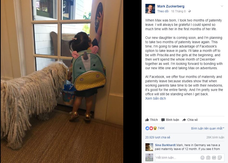 Tỷ phú Mark Zuckerberg cùng bà xã sắp chào đón cô con gái thứ 2. Ông chủ Facebook sẽ nghỉ việc 2 tháng để chăm vợ con. Dòng trạng thái trên Facebook của Mark Zuckerberg thu hút nhiều lượt thích, chia sẻ và bình luận.