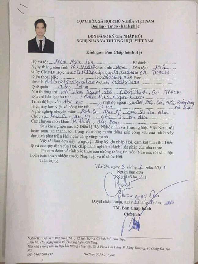 Thế nhưng, mới đây trên một số diễn đàn lại xuất hiện lá đơn đăng ký của Ngọc Sơn. Trong đó, anh tự nhận nghề nghiệp của mình là “danh ca, nhạc sĩ, giáo sư âm nhạc”.