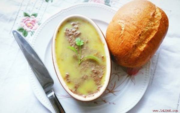 Trong lúc chờ bơ chảy, bẻ vụn bánh mì, đổ sữa vào ngâm cho bánh mì mềm. Không nên ngâm bánh mì quá sớm sẽ làm bánh bị nhũn không ngon.