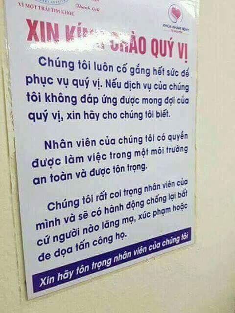 Cùng thời điểm này, trên mạng xã hội lan truyền tấm bảng chào được cho là ở Bệnh viện Hà Nội có nội dung liên quan đến thái độ của nhân viên y tế - bệnh nhân và ngược lại.