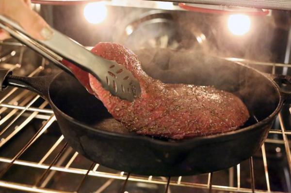Đầu tiên, đặt vỉ nướng dưới thanh nhiệt từ 15 đến 20cm và đặt chảo lên vỉ nướng. Bật lò lên khoảng 20 phút. Sau 20 phút, chỉnh lò lên nhiệt độ cao vài phút. Sau đó, lấy chảo ra thật cẩn thận rồi đặt lên bếp. Tiếp theo, đặt thịt bò lên giữa chảo khoảng 30 giây, sau đó lật mặt thịt và để thêm 30 giây nữa. Sau đó, đưa chảo thịt bò vào lò nướng.