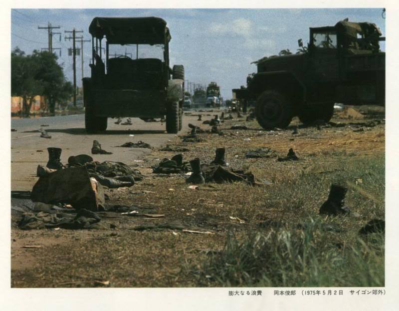 Thảo nào! Tôi nghĩ thầm, Trí quay qua tôi nói: ” Ḿnh ráng kiếm xem coi có cây ru lô nào không anh “. Tuổi thanh thiếu niên, hầu như ai cũng thích được sở hữu một khẩu súng lục trong tay, Trí và tôi cũng vậy. Do đó, nó mới rủ tôi đến đoàn xe nhà binh vô chủ trên cánh đồng để kiếm nhưng hai đứa leo tới leo lui lục lọi từng chiếc một mà vẫn không thấy. Nếu c̣n th́ đám thanh thiếu niên ban năy đă xí phần rồi v́ khi tôi và Trí vào đây đă thấy mặt họ từ trước. Dù vậy, cả hai đứa tôi vẫn cố sục sạo trong đống đồ đạc lính bỏ sót lại ở thùng xe. Súng trường M 16 nằm đầy chung quanh nhưng làm sao tôi dám mang một khẩu về nhà! Đám du kích biết là chết, ru lô th́ c̣n dấu trong người được. Chỗ nào cũng gặp lựu đạn thân tṛn như quả vú sữa hoặc giống hệt quả na rất đẹp nhưng sợ nó nổ bất tử nên hai đứa tôi chẳng dám đụng vào. Gió đồng bắt đầu thổi tạo thành các vệt sóng màu cẩm thạch uốn éo trên mặt lúa con gái trong các thửa ruộng trông thật đẹp. T́m không ra súng, tôi và Trí đành bỏ đoàn xe và quay trở ra ngoài đường lộ mà chưa biết sẽ làm ǵ tiếp. Trời đă gần chiều, xa xa có bóng một phụ nữ mặc áo trắng đang lui cui nhặt t́m cái ǵ đó ở gần lề đường. Hai đứa tôi tiến lại chỗ người phụ nữ. Bà đang xem từng tấm thẻ căn cước quân nhân, thẻ bài kim khí, thẻ lănh lương của lính vất nằm vương văi trên đường, ở các cạnh bờ ruộng hoặc dạt vào chân các bụi lúa. Nhiều tấm thẻ nḥe mực dấu đỏ, bết đất śnh hoặc thấm ướt đẫm nước. Vài mũ sắt, giầy trận, dây thắt lưng lính… nằm rải rác sát đường nhựa. Mắt người phụ nữ này đỏ hoe như vừa khóc xong. Tôi nh́n bà, hỏi:
