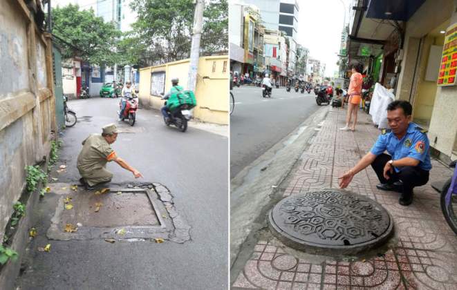 Nắp cống bằng thép bóng loáng, trơn trượt, lồi lên trũng xuống dọc ngang trên nhiều con đường, có nhiều nơi “hội tụ” nhiều đến nỗi trông mặt đường như chiếc áo vá, tả tơi luôn tiềm ẩm rủi ro với người đi đường ở Sài Gòn.