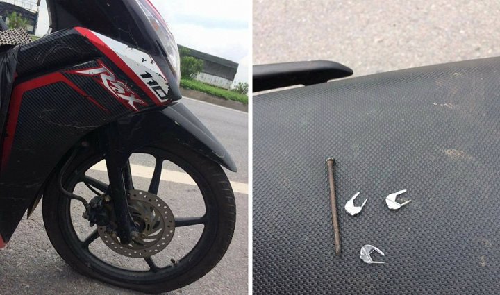 Theo người dân, số lượng đinh được rải ra đường rất nhiều, có cả loại đinh chuyên dụng để găm vào bánh xe và có hàng trăm phương tiện bị dính đinh.