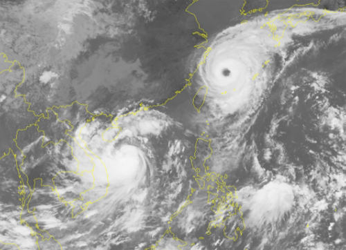 Ảnh vệ tinh hai cơn bão Talim (bên phải) và Doksuri (bên trái) đang hoạt động ở khu vực Thái Bình Dương. So sánh tương quan, Talim đang rất mạnh, mắt bão to, sắc nét.