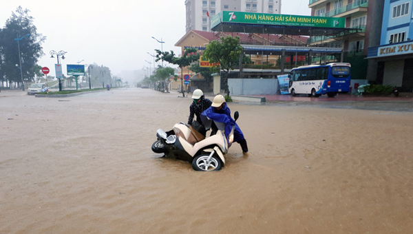 Trưa nay bão số 10 đã đổ bộ vào đất liền các tỉnh Hà Tĩnh, Quảng Bình. Gió bão rất mạnh kèm mưa lớn khiến các phương tiện di chuyển trên đường phải đứng lại, nỗ lực để không bị gió thổi bay.