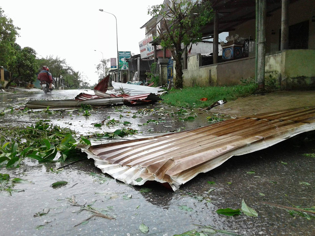 Mái tôn bị gió bão thổi bay xuống đường