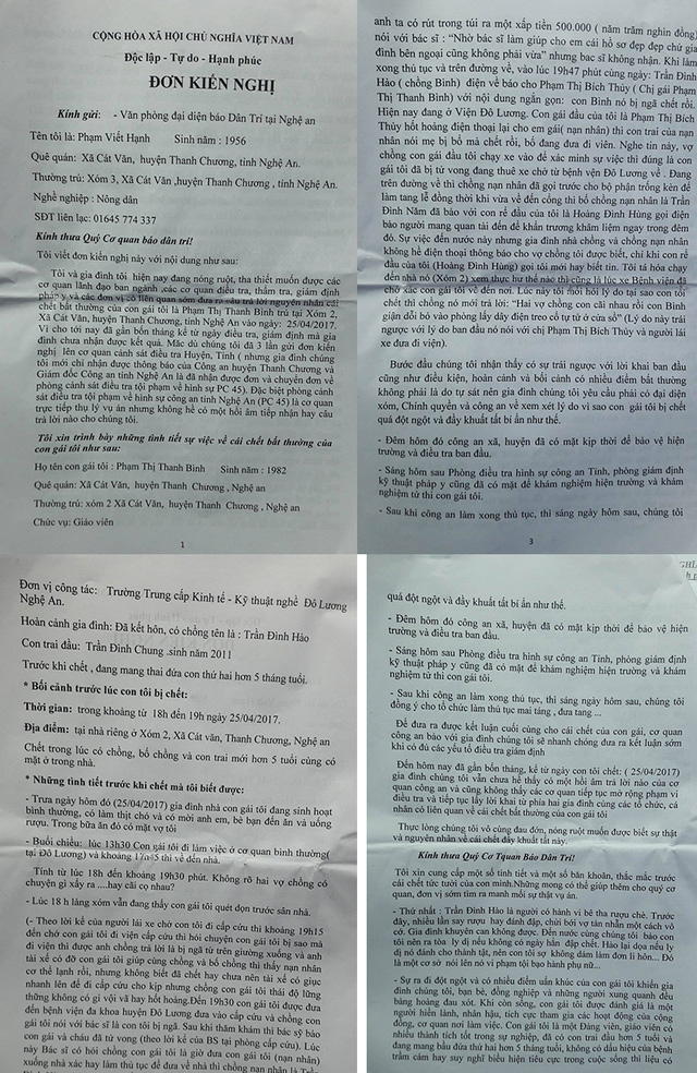 Trong đơn gửi Báo điện tử Dân trí của gia đình ông Phạm Viết Hạnh (SN 1956, trú tại xã Cát Văn, huyện Thanh Chương, Nghệ An). Nội dung đơn thư ông Hạnh phản ánh những hoài nghi liên quan đến cái chết đột ngột của con gái ruột mình là Phạm Thị Thanh Bình (SN 1982).