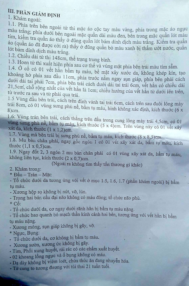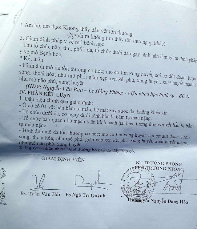 Kết luận ban đầu của cơ quan điều tra nói nguyên nhân chết là do dây treo cổ? Tuy nhiên, gia đình nạn nhân cho rằng, có thể chị Bình bị đánh đập rồi tạo hiện trường giả.
