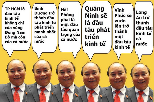 Chẳng hiểu Bác Phúc thủ tướng hứng cái gì mà đến tỉnh thành nào bác cũng khơi khơi gắn cho cái đầu tàu. Thế là mạnh tàu nào tàu nấy chạy. Chạy tới hay chạy lùi, tùy ý. Nhưng chỉ trên 1 đường sắt nửa tư bản, nửa xhcn.