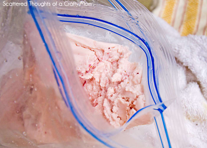 Cho sữa, đường và toàn bộ nguyên liệu làm kem vào một túi zip nhỏ. Lấy một túi zip lớn hơn, cho đá vào đầy 3/4 túi rồi cho túi sữa vào giữa. Dùng khăn bao kín quanh túi và lắc thật mạnh trong 5-10 phút tới khi sữa dần đông lại thành kem. Nhẹ nhàng mở miệng túi và múc kem ra thưởng thức.