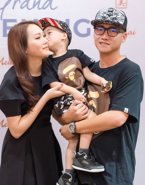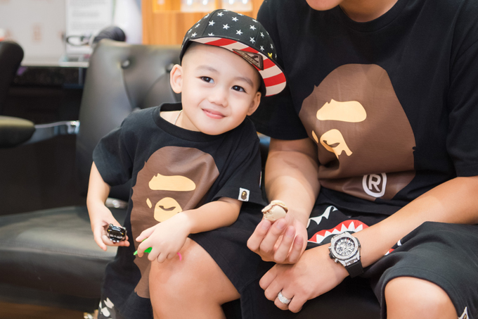 Đến dự event, ông xã Ngọc Thạch và con trai Ricky mặc ton sur ton từ quần áo đến phụ kiện mũ, giày.