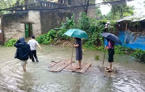Sáng 11/10, trên mạng xã hội xuất hiện hình ảnh hai phụ nữ mặc váy đứng trên bè mảng và được một người đàn ông kéo qua đoạn đường ngập nước.