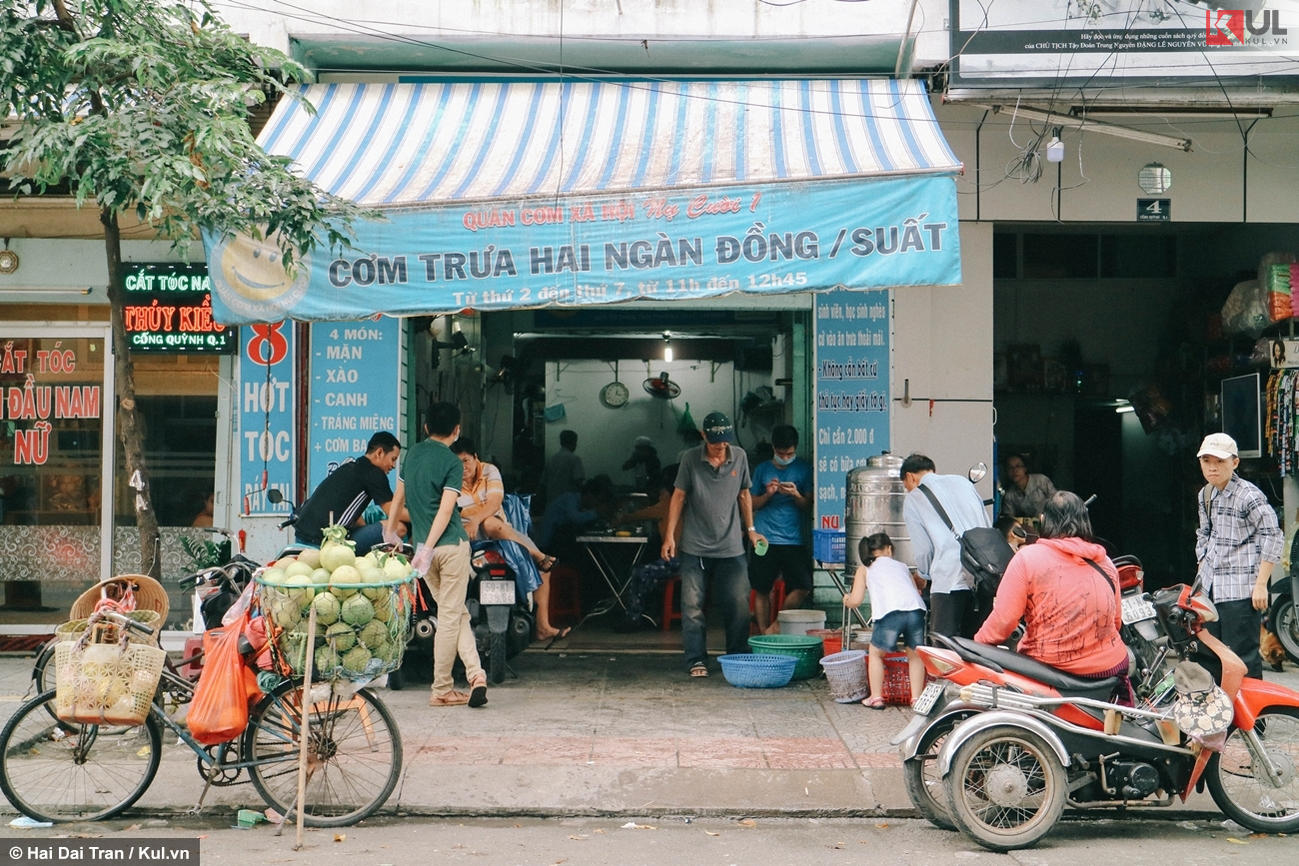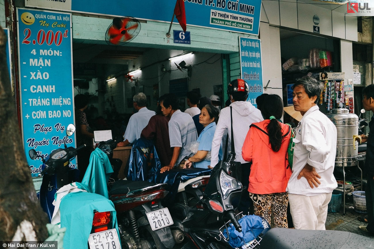 Trưa 14/10, Kul.vn có mặt tại quán cơm xã hội Nụ Cười, một “thương hiệu” quen thuộc đối với những người lao động nghèo. Trước quán là một hình ảnh đã thành quen thuộc khi rất đông sinh viên xếp hàng để mua những suất ăn 2.000 đồng.