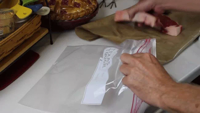 - Sau đó, bạn cho nước mắm vào túi và dùng tay massage cho miếng thịt thấm nước mắm đều hơn.