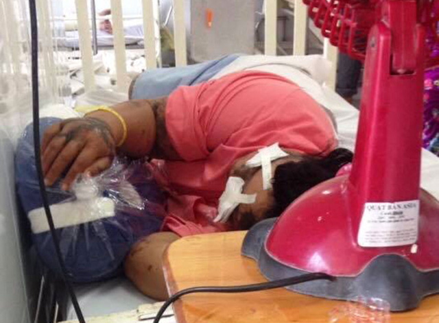 Bác sĩ Trần Văn Khoa, Khoa Phỏng - Phẫu thuật tạo hình Bệnh viện Chợ Rẫy (TP.HCM), cho biết khoa cấp cứu tiếp nhận bệnh nhân khoảng 19h30 ngày 20-10. Bệnh nhân bị bỏng axit 11% vùng mặt, hai tay, hai đùi. Bệnh nhân còn bị bỏng kết, giác mạc độ 4 và da mi hai mắt do axit, bỏng da độ 3 do axit.