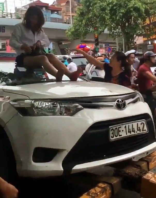 Nhiều người dân đã tụ tập tại đường Đại Cồ Việt để xem cảnh người phụ nữ ngồi trên nóc ô tô. Do vi phạm giao thông, nữ tài xế này đã bị yêu cầu dừng xe. Tuy nhiên, người này quyết không thực hiện và đã trèo lên nóc ô tô ngồi để chống đối.