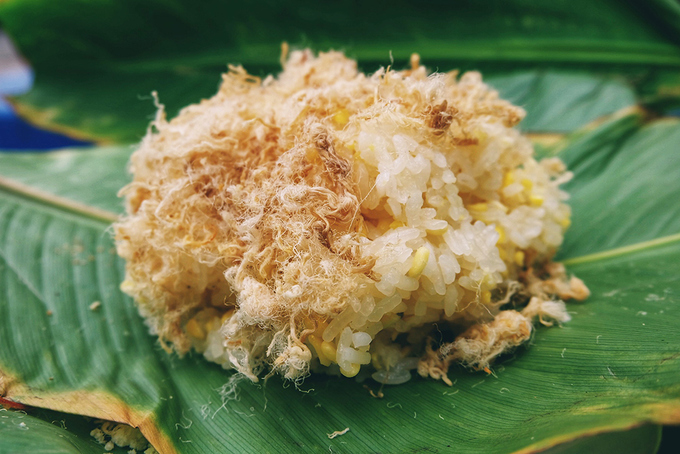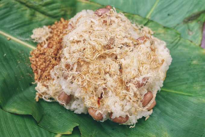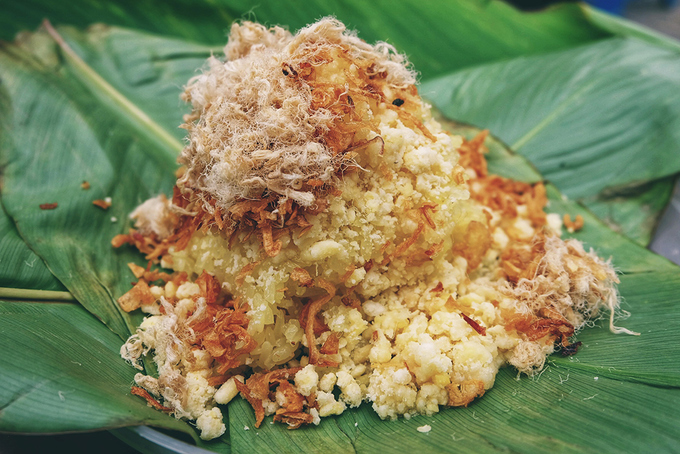 Gói xôi nóng hổi, từng hạt óng mỡ, thơm mùi nếp, đậu xanh, hành phi màu cánh gián, giòn, phảng phất mùi lá chuối. Người bán còn cho thêm chút ruốc (chà bông) để tăng vị.