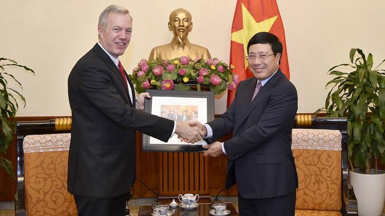 Hôm nay, Phó Thủ tướng, Bộ trưởng Ngoại giao Phạm Bình Minh đã tiếp Đại sứ Hoa Kỳ tại Việt Nam Ted Osius đến chào từ biệt nhân kết thúc nhiệm kỳ công tác.Phó Thủ tướng chúc mừng Đại sứ Ted Osius có nhiệm kỳ thành công tại Việt Nam, nổi bật là tổ chức nhiều chuyến thăm của lãnh đạo cấp cao hai nước với số chuyến thăm nhiều nhất trong nhiệm kỳ một Đại sứ Hoa Kỳ tại Việt Nam từ trước đến nay.