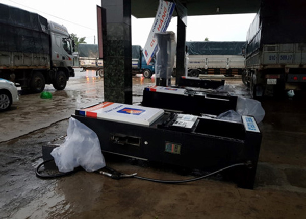 Một trụ bơm xăng bị gió lớn làm đổ. (Ảnh: VnE)