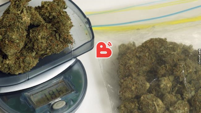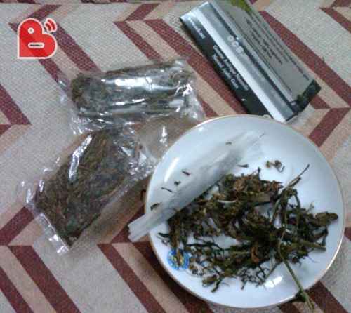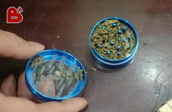 túi được khui, có 2 bọc giấy to, bên trong chứa nhiều thảo mộc khô, dạng sợi nghi là cần sa cùng với đó là 1 cân tiểu ly, máy ép và một số dụng cụ chế và sử dụng cần sa.